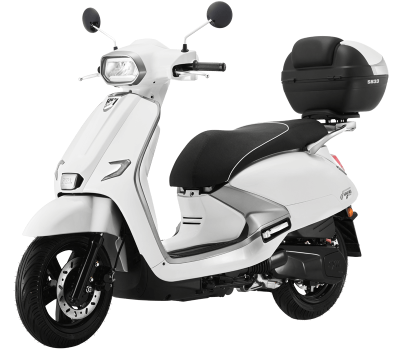 De Fugue 125, geïnspireerd op de klassieke muziekvorm "Fugue", heeft alles wat je van een moderne klassieke scooter mag verwachten: volledige LED-verlichting, een LCD-instrumentenpaneel, USB QC 3.0-aansluiting, dubbele schijfremmen en maar liefst 27 liter opbergruimte onder het zadel. Maak een levendige rit door de stad en steel de show met de Fugue 125.